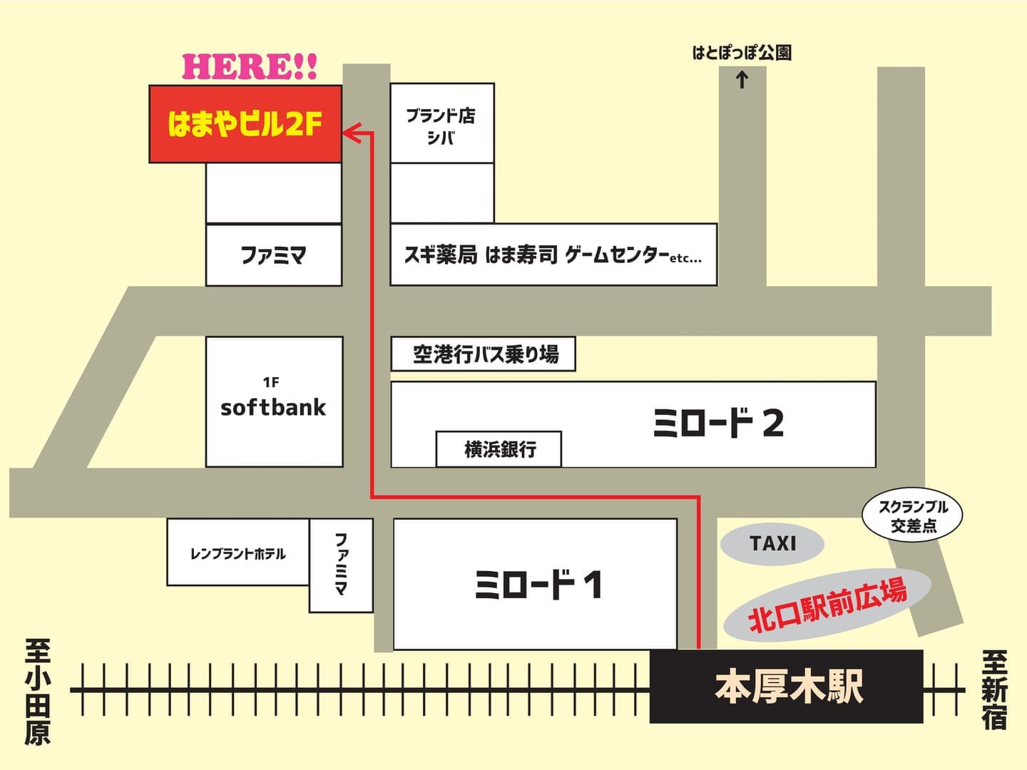 本厚木駅北口、ミロード1を左手にロータリー横を直進後左折し、一つ目の横断歩道を渡ると、右側にミロード2がございます。その間の道を直進すると左側にファミリーマートがあり、さらに直進していただくと左手に見えますレンガのビルが『はまやビル』です。